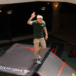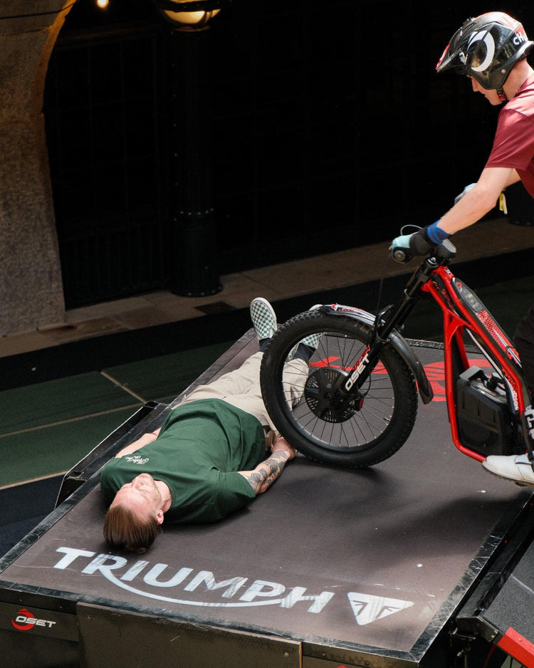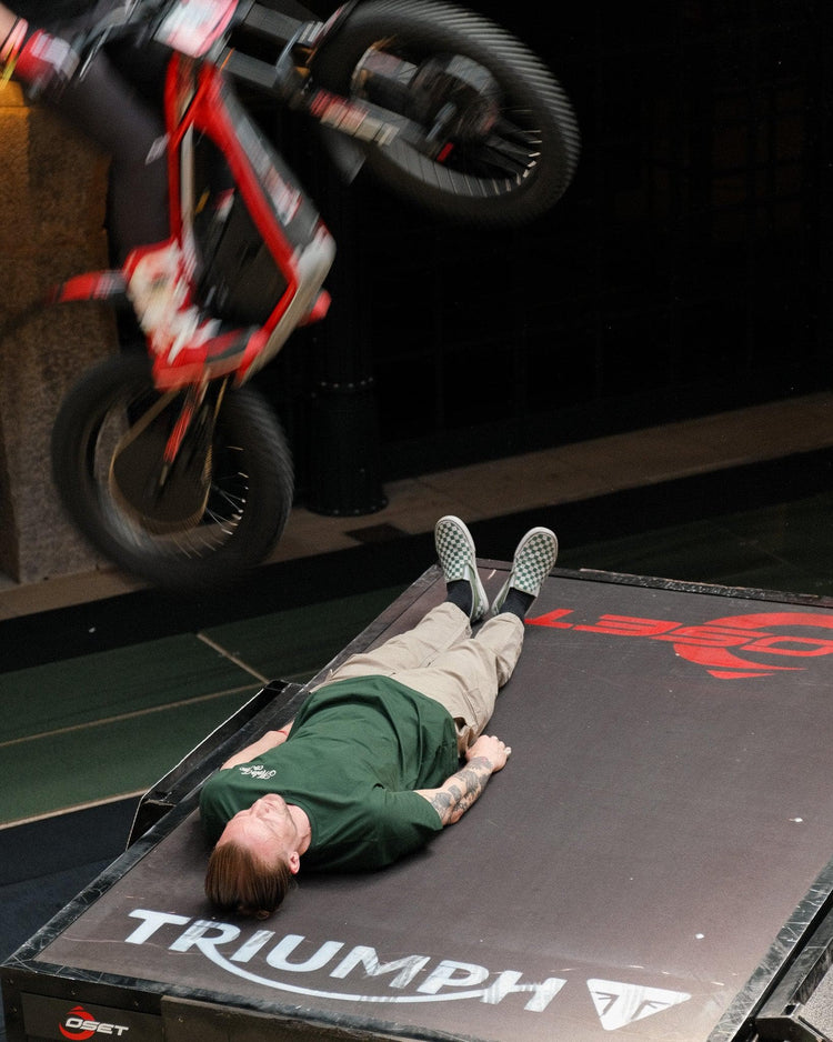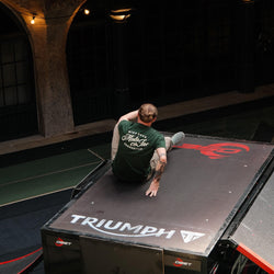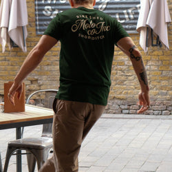 Model wearing our green BSMC Logo Shoreditch Motorcycle T-Shirt